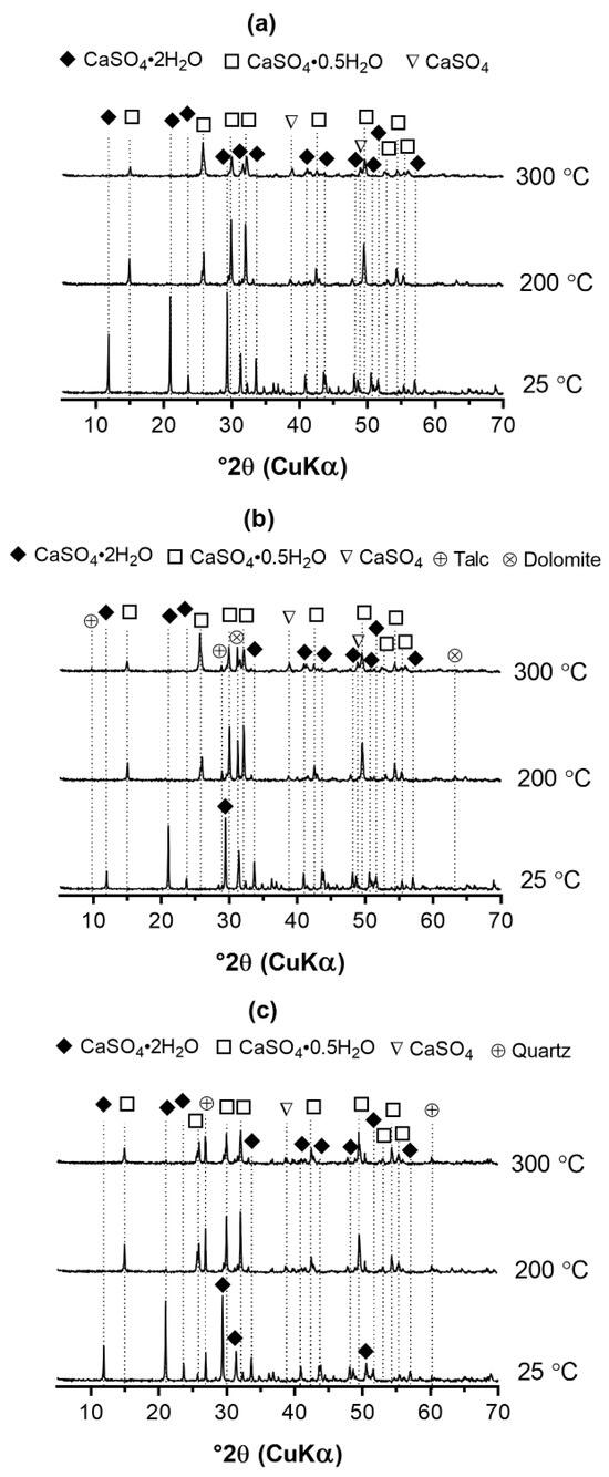 XRD patterns of gypsum specimens after being treated at 200 °C and 300 °C, with 25 °C as the reference: (a) GYP, (b) TAC, and (c) SIL.
