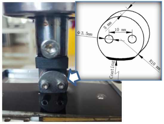 A high-speed reciprocating friction and wear tester (model: MDW-02 from Jinan Yihua Tribology Testing Institute, Jinan, China) was used to study the wear performance of the coatings against 360-mesh SiC sandpaper at room temperature for 90 min per specimen, using water as the lubricating medium. The dimensions of the wear test specimen are shown in Figure 2, and the testing force was set as 20 N. The reciprocating wear distance was chosen as 30 mm with a 2 Hz testing frequency. During the test, the sandpaper was replaced once the reciprocating wear time reached 30 min. Three wear specimens were taken as a group to calculate the average weight loss.