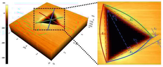 where θi is the top angle of an isosceles triangle with a base of Li (as shown in Figure 3 for a typical AFM scan of a nanoindentation impression). To account for pile-up, Li was related to the maximum indentation depth, hmax, and the pile-up height, hpi, using Equation (3) derived from the O&P model []: