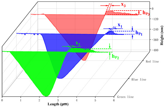 Line profiles across the indentation AFM scans in Figure 3, showing how the pile-up height hpi (i = 1, 2, 3) and width xi (i = 1, 2, 3) are determined.