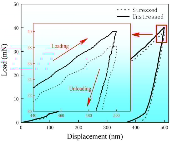 The load–displacement curve of the selected indentation in Figure 3 is shown in Figure 7, with the maximum indentation depth set as 500 nm. It was found that the indentation load required to reach the same indentation depth for the coatings was clearly less than that for the corresponding stress-free sample, which indicates a tensile residual stress. Moreover, the elastic recovery of the coating sample was also found to be smaller during the unloading, which proved that the residual stress acted as resistance to the elastic recovery. The above analysis clearly demonstrates the presence of compressive residual tensile stresses inside the coating [].