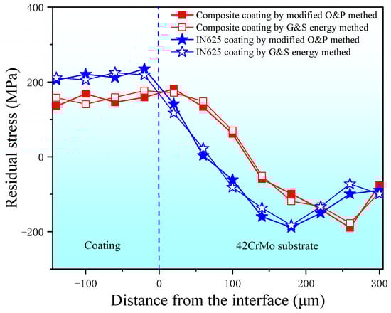 In this study, indentations were performed across the interface for the composite coating and pure IN625 coating samples, and pile-ups of all nanoindentations were directly measured by AFM. The true projected contact area, A, of all indentations was then calculated using Equation (5) to apply for pile-up correction. The residual stress distribution shown in Figure 8 was obtained by selectively choosing Equation (6) or Equation (7) depending on the stress state. It is obvious that tensile residual stress exists in both the (Ti, Nb)(C, B)/IN625 composite coating and IN625 coating samples. The peak value of residual tensile stress in the IN625 coating at the position of the interface is estimated to be about 235 MPa, followed by a steep drop as indenting proceeded into the heat-affected zone (HAZ) of the 42CrMo substrate, before reaching a steady state of compressive stress around 100 MPa. However, the peak value of the residual tensile stress of the (Ti, Nb)(C, B)/IN625 composite coating occurred at the coarse-grain heat-affected zone (CGHAZ) of 42CrMo, estimated to be about 180 MPa, before showing a moderately decreasing trend. The reduction of maximum tensile residual stress and the slowdown trend for the composite coating is mainly attributed to the presence of an exothermic system during the formation process of (Ti, Nb)(C, B)/IN625, where the heat emission can greatly reduce the temperature gradient of the USLC melt pool and delay the cooling rate. Moreover, there is a high similarity between the residual stress values calculated using the modified O&P method in this paper and the G&S energy method, respectively. This finding is consistent with previous published work [].