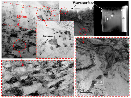 The DSA-TEM analysis results in Figure 10 clearly show the morphologies of the (Ti, Nb)(C, B)/IN625 composite coating after wear testing. Three types of different features from top to bottom can be distinguished in the wear subsurface region, including the equiaxed ultra-fine crystalline region in the range of 0–250 nm, the fine grain region in the range of 250–800 nm, and the original coating region beyond 800 nm. The combined effects of axial loading and thermal accumulation during wear testing [] can introduce grain refinement within the range of 800 nm under the wear surface, and these refined grains show elongated shapes with directionality preference. The grain refinement process is mainly related to the thermal-force-coupled dynamic plastic deformation during wear testing [], often referred as dynamic recrystallization []. Dislocations in low-level fault-energy material can be made to re-nucleate and re-grow grains at the original grain boundary by slipping/climbing, which in turn eliminates the dislocations and deformation defects such as sub-grain boundaries in the deformed substrate []. Ultra-fine equiaxed crystals in the range of 250 nm were observed in this study with grain sizes of 10–50 nm, as the Ti(C, B) particles synthesized by the in-situ reaction play key roles of abrasion reduction and regional supporting towards the IN625 substrate, and the abrasion plowing of the SiC sandpaper on the coating substrate IN625 was significantly reduced (the depth of abrasion plowing shown in Figure 9a is significantly smaller than that shown in Figure 9b), which on the contrary promotes the continuous thermoplastic deformation of the wear surface. Finally, under the coupling of plastic–thermal–force fields via strong surface friction, super-plastic deformation was promoted to occur in the wear surface zone within a depth of 250 nm, to obtain the microstructures of equiaxed ultra-fine grains. It is important to note that the presence of a large number of twinning inside the ultra-fined equiaxed grains confirms the existence of superplastic deformation in the wear surface region under a depth of 250 nm, and the characteristics of the wear morphology in Figure 9a show the local adhesive wear as well.