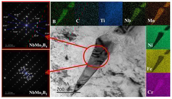 EDS analysis and electron diffraction analysis were also carried out for the needle-like phase in selected area #2 in Figure 10 (see Figure 13). This phase presents an intergranular distribution, and the precipitated positions are consistent with the blue-marked phases shown in Figure 6b. It is determined by diffraction pattern analysis that this phase consists of unstable NbMo3B4 and unstable NbMo2B2, which have a parallel phase relationship of [001]NbMo2B2//[–403]NbMo3B4. The formation of those unstable phases is not related to the lack of stable thermodynamic conditions mentioned above for USLC, but to the presence of a strong boride precipitating element Nb and weak boride precipitating element Mo in the IN625 substrate. By transient melting pool metallurgy, the residual B is combined with Nb and Mo in a short time, and finally the unstable Nb-Mo-B composite precipitation phases mostly formed at grain boundaries; this plays an auxiliary role in restraining plastic deformation during the wearing process.
