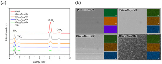 Results of X-ray microanalysis investigations for as-deposited copper and titanium oxide thin films: (a) EDS spectra and (b) maps of elemental distribution of mixed oxides.