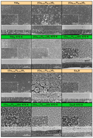 Scanning electron microscopy images of the surface and cross-section of as-deposited and annealed at 473 K TiOx, (CuTi)Ox, and CuxO thin films.
