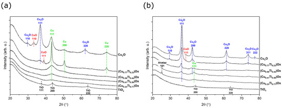X-ray diffraction patterns of (a) as-deposited and (b) annealed at 473 K (CuTi)Ox thin films.