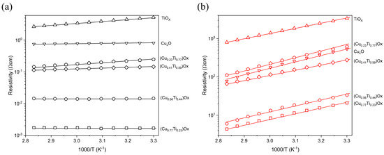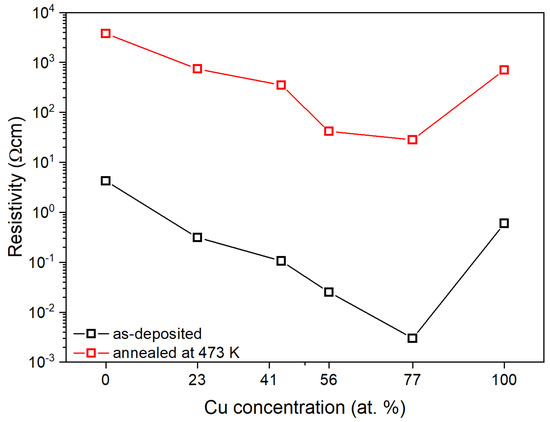 The obtained electrical parameters are presented in Table 3. With the increase in the copper concentration in the thin film, the resistivity of the (CuTi)Ox gradually decreased and for thin films with 56 and 77 at.% of Cu was equal to 2.5·10−2 and 3.0·10−3 Ω cm, respectively (Figure 6). Annealing at 473 K caused an increase in the resistivity by ca. three orders of magnitude for all thin films except (Cu0.77Ti0.23)Ox for which the resistivity increased almost four orders of magnitude. The resistivity of the TiOx sample after thermal treatment was 3.8 × 103 Ω cm. Titanium monoxide is generally perceived as an excellent conductor with a resistivity value in the range of 10−4–10−3 Ω cm [50,51,52,53]. However, there are also reports showing that the resistivity value of nanocrystalline TiO can be as high as 105 Ω cm [54]. Therefore, the resistivity value obtained in this work falls within the wide range reported in the literature, while its quite high value may be explained by a large amount of the amorphous phase present in the thin film, as evidenced by the low intensity of the peaks visible in the XRD (Figure 4). The CuxO and (Cu0.23Ti0.77)Ox thin films after annealing had a resistivity equal to ca. 7 × 102 Ω cm. The addition of 41 at.% of Cu caused a decrease in ρ by an order of magnitude compared to the TiOx sample. A further increase in the Cu content resulted in a gradual decrease in resistivity, which was equal to 41.5 Ω cm and 28.1 Ω cm for (Cu0.56Ti0.44)Ox and (Cu0.77Ti0.23)Ox.