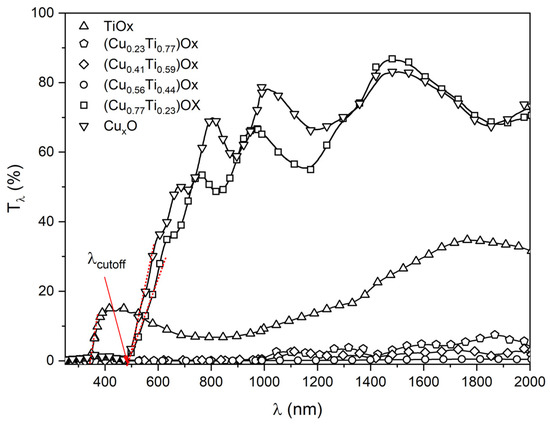 The optical properties of the (CuTi)Ox thin films were determined on the basis of the transmission measurements of light in the wavelength range from 250 nm to 2000 nm. All as-deposited thin films were opaque, which could be the consequence of the low oxygen concentration during the sputtering process [55], resulting in the presence of metallic copper crystallites in the CuxO and in (CuTi)Ox thin films. In the visible wavelength range, the transmission of the as-deposited thin films was less than 2%. As can be seen in Figure 8, the post-process thermal treatment strongly influenced the optical properties of the TiOx, (Cu0.77Ti0.23)Ox and CuxO thin films as they oxidized and became transparent, mainly in the infrared region. Moreover, interference fringes began to appear. However, the samples with 23, 41, and 56 at.% of Cu remained opaque. The absorption edge of the TiOx thin film was positioned at the cut-off wavelength (λcut-off) equal to 339 nm, while a redshift to ca. 490 nm was observed for the (Cu0.77Ti0.23)Ox and pure copper oxide films. This observation is consistent with the data reported for λcut-off for non-stoichiometric TiOx and CuxO thin films [56,57]. The average transmittance of TiOx in the visible wavelength range was equal to 11%, while for the (Cu0.77Ti0.23)Ox and CuxO thin films it was equal to 22% and 27%, respectively. In turn, in the near infrared wavelength range the average transmittance increased slightly for the TiOx and was equal to 21%, but for the (Cu0.77Ti0.23)Ox and CuxO thin films it was even ca. 70%.