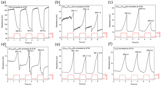 Resistance changes of: (a) TiOx, (b–e) (CuTi)Ox, and (f) CuxO thin films annealed at 473 K upon exposure to 3.5% H2.