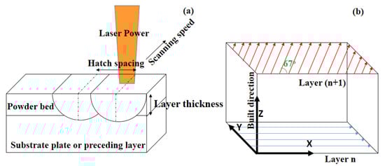 (a) Selective Laser Melting process parameters: laser power 370 W, scanning speed 1300 mm/s, hatch spacing 0.19 mm and layer thickness 30 µm; (b) X, Y and Z directions for sample and 67° rotation of scanning direction.