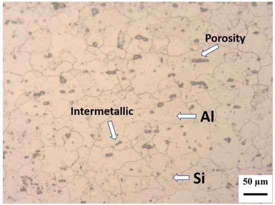 Optical micrograph of as-cast AlSi10Mg alloy showing intermetallic, porosity and silicon particle within the aluminum matrix.