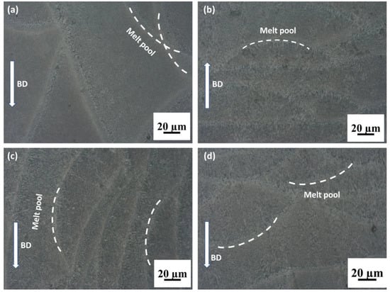 Optical micrographs of (a) horizontally built under Ar; (b) vertically built under Ar; (c) horizontally built under N2; (d) vertically built under N2 of the SLMed AlSi10Mg alloy. (Note: BD is an abbreviation for built direction).