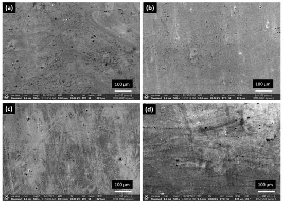 SEM micrographs of (a) horizontally built under Ar; (b) vertically built under Ar; (c) horizontally built under N2; (d) vertically built under N2 of the SLMed AlSi10Mg alloy at 500× magnification.