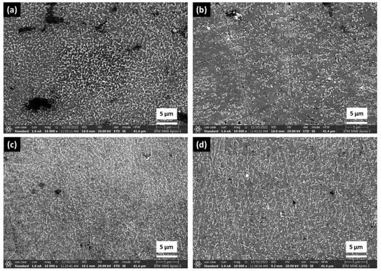 Figure 4a,b show the SEM micrographs of as-cast AlSi10Mg alloy at 1800× and 30,000× magnification. Figure 5a–d show the SEM micrographs of the SLMed AlSi10Mg alloy in four conditions at 500× magnification. For the SLMed counterparts, the microstructure consisted of overlapped melt pools (Figure 5a–d), which is due to the progressive laser rastering which causes melting and solidification of successive layers of materials. Within the melt pools, a very fine dendritic structure of the α-Al matrix bounded by the eutectic Si phase developed. Figure 6a–d show the SEM micrographs of the SLMed AlSi10Mg alloy in four conditions at 10,000× magnification. The extremely high cooling rates involved in selective laser melting caused a strong microstructural refinement. The additive manufactured (as-built) AlSi10Mg parts consisted of a fine network of Si particles inside the aluminum matrix as shown in Figure 6a–d. Microstructural refinement may therefore be the cause of the improvement of the corrosion resistance of the as-built SLMed AlSi10Mg specimens when compared with their cast counterparts. Microstructure refinement could be observed at 10,000 x SEM micrographs (Figure 6a–d).