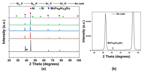 (a) XRD pattern for the SLMed AlSi10Mg alloys for all four conditions, namely under nitrogen vertically built, under nitrogen horizontally built, under argon vertically built and under argon horizontally built, and as-cast AlSi10Mg alloy (Note: N2_V, N2_H, Ar_V, and Ar_H represents SLMed AlSi10Mg under nitrogen vertically built, under nitrogen horizontally built, under argon vertically built and under argon horizontally built, respectively); (b) a zoom of XRD pattern for as-cast AlSi10Mg showing MnFe4Al12Si2 peaks in XRD plot.
