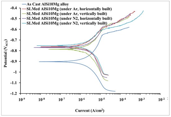 The SLMed AlSi10Mg alloys demonstrated an improvement in corrosion resistance of approximately 2–3 times compared with the as-cast AlSi10Mg alloy. The corrosion resistance did not vary much depending on the working environment and built direction. Even though the improvement in corrosion resistance of SLMed AlSi10Mg is not very impressive, it is still significant to note that there was a 2–3-fold improvement compared with as-cast AlSi10Mg. Therefore, such additive manufactured samples can find potential applications where the components are subjected to corrosive conditions and where the additively manufactured component has an advantage over the as-cast component due to the various advantages of additive manufacturing, e.g., freedom of design.