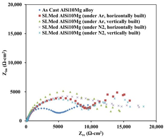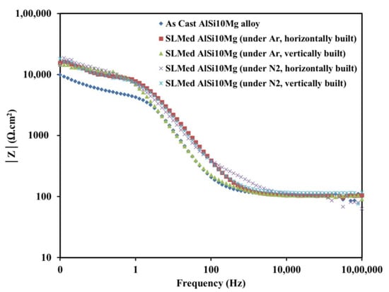 The corrosion potential (Ecorr) of the SLMed AlSi10Mg alloys (different conditions) was approximately 120–150 mV higher than that of the as-cast AlSi10Mg alloy (Figure 8). Since Ecorr is the measure of corrosion susceptibility, a positive shift in Ecorr suggests that the samples made by the additive manufacturing process have better corrosion resistance compared with that of as-cast samples. The corrosion current densities (icorr) of both of the SLMed AlSi10Mg alloys were found to be 2–3 times lower than that of the as-cast AlSi10Mg alloy, indicating a 2–3-fold improvement in corrosion resistance. The modest rise in the applied potential caused a fast increase in the anodic current demonstrating pitting corrosion characteristics, which was more prominent for the as-cast AlSi10Mg alloy sample than for the additively manufactured AlSi10Mg alloy sample, as shown in the anodic branch of the Tafel plots in Figure 8. The values of Epit-Ecorr for SLMed AlSi10Mg (under Ar, horizontally built) and as-cast samples were found to be approximately 173 mV and 243 mV, indicating a narrow passive region above the corrosion potential. Similar behaviour was observed for the other conditions of the SLMed AlSi10Mg alloys. Therefore, for definite conclusions regarding improvement in corrosion resistance, EIS studies were performed in addition to potentiodynamic polarisation.