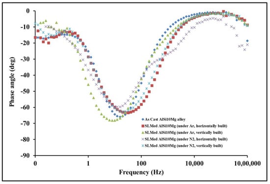 Electrochemical impedance spectroscopy (EIS) was used to examine the stability of the protective passive layer on the SLMed AlSi10Mg alloy and the as-cast AlSi10Mg alloy after 30 min of immersion in 0.1 M NaCl solution. The magnitude of impedance at the lowest frequency in a Bode impedance plot and the diameter of the semicircle in a Nyquist plot are broad measures of the corrosion resistance. The Nyquist and Bode plots of SLMed AlSi10Mg under different conditions and the as-cast AlSi10Mg alloy (Figure 9 and Figure 10) demonstrate that the corrosion resistance of the SLMed AlSi10Mg alloy was 2–3 times better. The Bode phase plots for SLMed alloys under different conditions and as-cast AlSi10Mg after 30 min of immersion in 0.1 M NaCl solution are shown in Figure 11. The broad-phase angle troughs (minima, as phase angle values are negative) suggest a merger of two time constants in all conditions. The two time constants are related to corrosion products/solution interface and metal/solution interface. The presence of two time constants is determined by the broader nature of phase angle plots, because when two narrower peaks related to two time constants merged in phase angle plots, there was a formation of a broader peak in the phase angle plot.