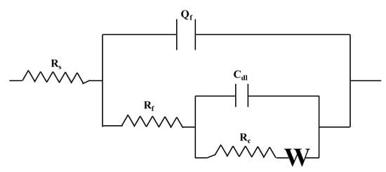 A simulation of experimental EIS data was performed to quantitatively evaluate the characteristic parameters such as capacitance, charge transfer resistance and pore resistance, etc., using an appropriate equivalent electrical circuit (EEC) and a speculative corrosion mechanism. An appropriate EEC with two time constants and a Warburg element is shown in Figure 12. The time constant related to the corrosion products/solution interface is in the high-frequency range, while the time constant related to the metal/solution interface is in the lower-frequency zone.