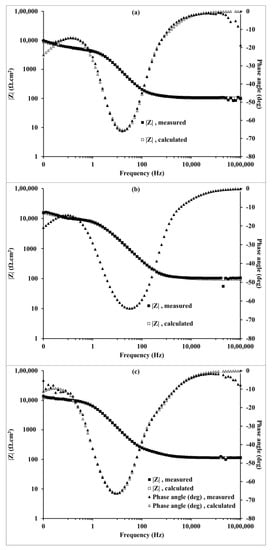 Curve fitting of experimental and simulated Bode plots for the following conditions: (a) as-cast AlSi10Mg alloy; (b) selective laser melted AlSi10Mg alloy under Ar, horizontally built condition; (c) selective laser melted AlSi10Mg alloy under N2, vertically built condition after immersion in 0.1 M NaCl solution.