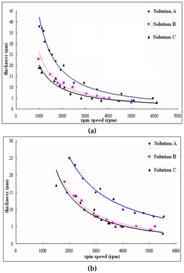 Relationships between the spin speed and film thickness for different cases. EVA solutions at three concentrations were considered to form the films on two surfaces: (a) inactivated glass board and (b) EVA-coated board. Because the friction force was stronger for the EVA-pretreated board, the corresponding film was thicker than for the inactivated glass board for the same spin speed. Solution A was prepared by dissolving 7 g EVA in 20 mL toluene, Solution B was prepared by dissolving the same amount of EVA in 30 mL toluene, and Solution C was prepared by dissolving the same amount of EVA in 40 mL toluene, as described in “Materials and Methods”. Accuracy of thickness: ±2.5 μm.