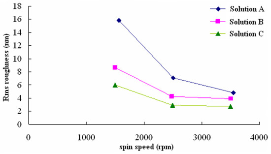 Film roughness results for different spin speed and viscosity scenarios. Film roughness depends on solution viscosity and spin speed, decreasing with increasing spin speed and/or decreasing viscosity. Film roughness was 2.762 nm for a spin speed of 3500 rpm using Solution C (with lowest viscosity). Roughness was measured using AFM.