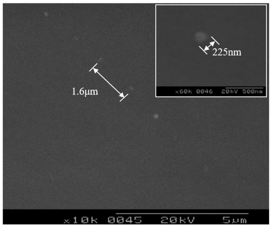 SEM images of melted dots on different-thickness transfer films. Transfer film thicknesses were (a) 39 μm and (b) 51 μm, while the dots’ diameters were 320 nm and 400 nm, respectively. Inset represents the SEM image taken at 60,000× magnification to show the diameter of melted dot. The effectiveness of the film in (b) was on a par with that of commercially available films.