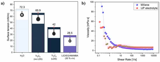 (a) surface tension values with correspondent pendant drop image; (b) viscosity plot for Ti3C2 MXene ink and LiCl/EG/AM/MBA (30% v/v) electrolyte inks.