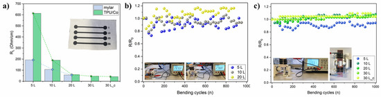 (a) initial RL of the Ti3C2 lines (50 × 2 mm) according to the overprinting layers on mylar film and TPU/Co (real picture in inset figure; (b) linear resistance retention upon bending cycles at 90° and 15 rpm for the printed Ti3C2 lines on mylar; (c) same on TPU/Co substrate. The real pictures of the test are reported as inset figures.