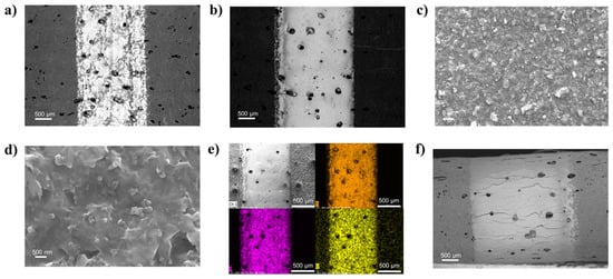 (a,b) SEM images of the Ti3C2 MXene printed lines on TPU/Co substrates at 5 and 20 L, respectively; (c,d) detail of the morphology of the 20 L surface; (e) EDS map (Ti, F, Cl) of the 20 L sample; (f) images in BSD mode of the 30 L line on TPU/Co in a bent state, with a focus on the curvature area.