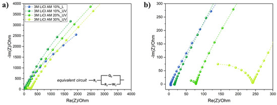 Electrolyte printing is definitely the main bottleneck in the development of miniaturized and flexible electrochemical capacitors and batteries for wearable and textronic applications. Liquid electrolytes cannot be employed because of technical difficulties with their insulation and leakage issues. On the other hand, gel polymer electrolytes are very viscous and not compatible with IJP technology. We formulated here a simple UV-curable ink electrolyte based on EG since it can easily dissolve high concentrations of LiCl, AM and TPO-L. The effect on the ionic conductivity of the AM content was investigated through EIS analysis (Figure 4). Nyquist plots revealed that R2 (sometimes termed also as the charge transfer resistance Rct) increased by increasing the AM content from 10 wt.% to 30 wt.% In particular, at 10 wt.%, the ionic conductivity dropped from 2.03 mS/cm before UV curing to 0.60 mS/cm after the UV exposure and crosslinking. The values of R2 and σ are given in Table 1. The 10 wt.% AM loading was selected because of the highest ionic conductivity, and even at this low loading, a transparent soft GPE was formed (Figure S5).