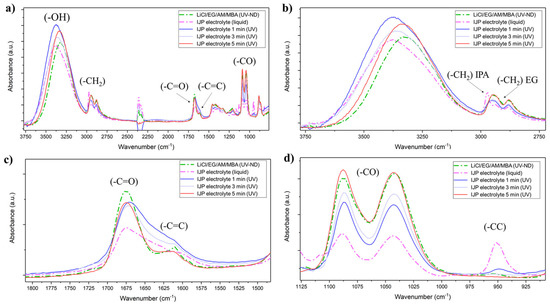 (a) ATR-FTIR of the non-diluted (ND) LiCl/EG/AM/MBA electrolyte precursor and inkjet-printable electrolyte in liquid and polymerized state after 1, 3 and 5 min of excess solvent evaporation; (b) focus on the absorbance spectra in the -OH and -CH2 absorbance region; (c) focus on the -C=O and -C=C region; (d) focus on the -CC region.