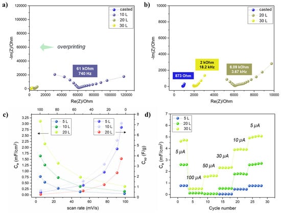The effect of the electrolyte overprinting layers (i.e., the total electrolyte amount) was investigated by EIS. Two Ti3C2 electrodes with interdigitated configuration were printed (20 L) on the TPU/Co textile, and 5 to 30 layers of electrolyte precursor were consecutively printed on top. Nyquist plots (Figure 7a,b) clearly showed that increasing the electrolyte overprinting layers on the Ti3C2 electrodes resulted in a consistent shift of the equivalent series resistance (RESR) to lower values. Since both the pattern, Ti3C2 MXene overprinting layers and inter-electrode distance (0.6 mm) were the same, the lower RESR could be attributed to the real impedance decreasing the GPE only. In fact, the RESR drastically decreased from 61 kOhm to 6.09 kOhm and 2 kOhm for 10, 20 and 30 L respectively. Even after 30 L, the RESR was close but higher (~ 2 times) than the “flooded” conditions obtained by manually casting ~ 0.3 mL of electrolyte precursor solution with a micropipette. All the subsequent results were obtained by fixing the electrolyte overprinting layers to 30.