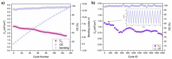 (a) Ca and coulombic efficiency (CE) with respect to galvanostatic charge-discharge (5 µA) and bending cycles; (b) Ca and CE of the long-cycling test performed with a galvanostatic charge-discharge current of 50 µA at rest (flat) condition (Ti3C2 20 L and electrolyte precursor 30 L). The voltage-time profile of the first few cycles is reported as the inset figure.