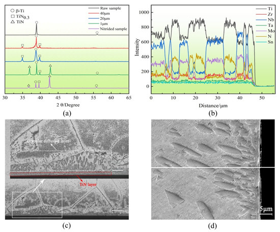 Figure 1c shows the cross-sectional metallographic structure of the nitrided TLM alloy etched using a Kroll etching solution under an OM. As shown in Figure 1c, a gradient nitride layer with a thickness of ~30 μm was obtained on the surface of the TLM alloy after induction nitriding. The nitride layer comprises a thin and dense TiN layer on the surface (shown by the red arrow in Figure 1c) and a granular diffusion layer on the subsurface (shown by the white arrow in Figure 1c). Moreover, to establish the distribution of elements in this sample region, the line scanning profiles are shown in Figure 1b,d. The contents of Ti and N were the highest in the nitride layer zone, whereas the contents of Zr, Nb and Mo were higher in the non-nitride layer zone.