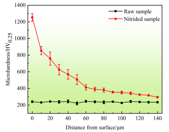 Figure 2 shows the hardness of the TLM alloy cross-section after the induction nitriding treatment. Notably, the nitride layer on the surface exhibits a very high hardness (~1253 HV), while the hardness of the nitride layer decreases with the increase in depth, and finally reaches the hardness of the substrate (~230 HV). The key reason for this considerable increase in surface microhardness is the formation of nitrides and solution strengthening of nitrogen. The formation of the TiN0.3 and TiN phases developed the hardness of the TLM alloy. TiN are hard, brittle phases [19], and thus, the formation of nitrides on the surface increases the surface hardness. The content of nitrides decreases with increasing distance from the surface, consequently, microhardness decreased with increasing distance from the surface. In addition, the error of the hardness value in the subsurface became more notable, which can be attributed to the grainy diffusion zone on the subsurface that is randomly distributed in the soft β-Ti substrate.