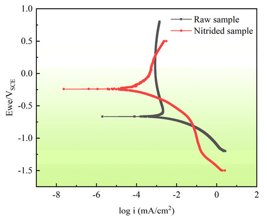 Figure 3 shows the potentiodynamic polarisation curves of the raw and the nitrided samples in SBF. The electrochemical corrosion parameters obtained by Tafel fitting are listed in Table 2. As indicated in Table 2, After Tafel fitting, we get electrochemical parameters such as corrosion current density (icorr), corrosion potential (Ecorr), anodic slope (βa) and cathodic slope (βc) are obtained after Tafel fitting. The corrosion potential of the sample after nitriding increased from −241.00 mV to −665.77 mV and the corrosion current density decreases by two orders of magnitude, which demonstrates that the corrosion resistance of TLM alloy is increased significantly after induction nitriding [29]. As shown in Figure 3, the shapes of the polarisation curves of the two samples are significantly different; indicating that the reaction mechanism is altered by the nitriding process. In the case of the raw sample, the corrosion process involves the spontaneous formation of TiO or Ti2O3, anodic transformation to TiO2, and the corresponding oxide growth [30]. However, the nitrided sample passivation region corresponds to the transformation of the TiN layer into a titanium oxy-nitride passive film, which occurs via oxidation [31]. In summary, the passivation performance of the raw sample in SBF is better than that of the nitrided sample.