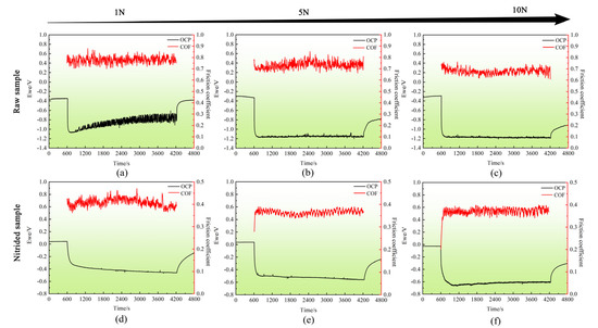 Time evolution of the coefficient of friction (COF) and the potential (OCP) during the tribocorrosion test of the raw sample and the nitrided samples in SBF solution for (a–c) Raw samples; (d–f) Nitrided samples.