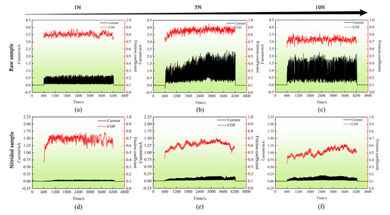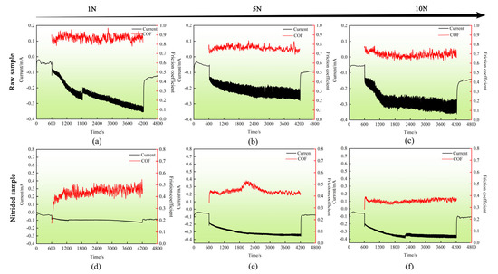 In the case of the cathodic applied potential (E = −1.2 V), the negative current measured corresponds to redox (dissolved oxygen and water) [34,35]. As shown in Figure 5, the measured current acquired increasingly negative values during sliding, indicating successful cathodic protection [36]. During the tribocorrosion process, the current fluctuated in both the raw and nitrided samples, and the amplitude of the fluctuation increases with the increase in load. The cause of these phenomena is hypothesised to be a dynamic balance between depassivation and re-passivation of the sample surface in the affected region. The COF of the nitrided samples were lower than those of the raw samples under different loading conditions. With increasing loading magnitude, the COF of the raw and nitrided samples decreases gradually. This may be because as the load increases, more debris is generated and some of which acts as a lubrican during friction process, resulting in the decrease in COF.