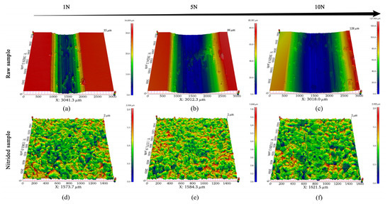 Figure 7 shows the 3D wear morphology of the raw and nitrided samples after the tribocorrosion test at OCP. As shown in Figure 7a–c, grooves along the sliding direction can be observed in the raw sample, the depth and width of the abrasion marks gradually increase with increasing loading. The nitrided sample showed a smooth wear surface (Figure 7d–f). It can be seen that the width and depth of the abrasion marks in the nitrided sample are considerably smaller than those observed in the raw sample. This observation can be attributed to three reasons. (1) The nitrided sample resulted the higher fatigue strength due to its higher hardness, which can effectively reduce the material loss caused by pure mechanical wear [39,40], (2) the excellent corrosion resistance of the nitride layer can considerably reduce the corrosion effect, and (3) a granular diffusion layer cooperates more effectively with the nitride layer of the surface to carry the contact stress and avoid stress concentrations at the interface and in the nitride layer [41,42]. The tribocorrosion resistance of titanium alloy is improved by the combined action of these factors, reducing the extent of the wear.