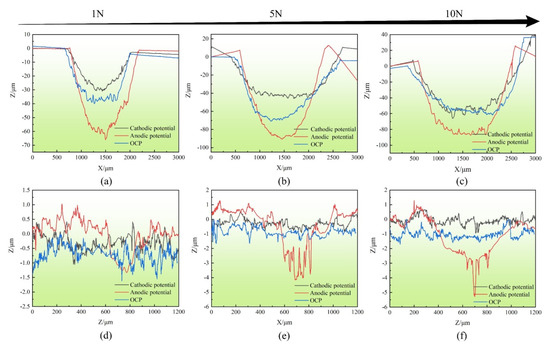 Wear profile after the tribocorrosion test of the (a–c) raw sample and the (d–f) nitrided sample under different conditions.
