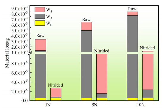 Material loss components of tribocorrosion of the raw and nitride samples at anodic potential (E = 1.0 V) under different loads.