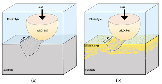 The suggested tribocorrosion mechanisms of the TLM titanium alloy before and after induction nitriding are shown in Figure 12. The parallel grooves in the abrasion marks on the raw and nitrided samples indicate the generation of abrasive wear, which can be explained by the ploughing action of debris on the alloy surface. It has been reported that different β-type titanium alloys have similar dominant abrasive and adhesive mechanisms under different testing conditions [48,49]. The raw sample showed a higher extent of material loss and a higher COF, which are associated with the formation of adhesive wear, as evidenced by the wear debris observed in the raw sample abrasion marks (Figure 8a–c). The relatively smooth wear surface observed on the nitrided sample indicates that the hardness of the material plays a vital role in the wear process. Considering that the hardness of the Al2O3 ball (~2300 HV) and TLM alloys (~230 HV) are significantly different, it can be inferred that ploughing friction is the primary factor responsible for observed material loss. The wear mechanisms in the case of the raw samples with relatively low hardness are mainly adhesive wear and abrasive wear. The wear mechanism in the case of the nitrided sample is abrasive wear, which is due to the bearing effect of the hard TiN phase on the surface [50] and the support effect of the granular diffusion layer with gradient distribution in the subsurface. After nitriding, uniform coarse grains of about 100 μm were formed on the surface while raised titanium nitride was formed in the grain boundary. This hard phase produced a relatively ordered microscopic texture along with the grain boundary, which can effectively reduce the contact area between the grinding ball and the TLM alloy, the shear force, and then the COF and wear amount. During tribocorrosion testing, a granular diffusion layer cooperates more effectively with the nitride layer of the surface to carry the contact stress, avoiding stress concentrations in the nitride layer and at the interface [41,42]. The improved tribocorrosion resistance of TLM alloy is mainly attributed to the compact TiN layer with high hardness and corrosion resistance on the surface and the coordinated deformation of the granular diffusion layer on the subsurface. Moreover, the nitride layer has excellent corrosion resistance, which considerably increases the tribocorrosion resistance of the nitrided sample. However, in the system with the interaction of corrosion and wear, the applied anodic potential and the formation of the galvanic corrosion cell accelerate the corrosion of the nitride layer. Due to the damage of the nitride layer, the potential decreased rapidly, and the potential difference between the grain areas thus went up, resulting in corrosion intensifies. Under the dual action of shear stress and corrosion, the grain boundary bulged, and the damage was accelerated, which induced the disappearance of the microscopic texture, the rapid increase in the friction area, and the remarkable promotion of the COF and wear volume. This makes the sample more vulnerable to damage under large loads. The formation of hard-wear debris can act as the third-body particle and eventually accelerate material loss [51]. The increase in mechanical wear due to corrosion makes the synergistic effect of wear and corrosion in the nitrided sample increase with increasing load, showing a trend contrary to that observed in the case of the raw sample.