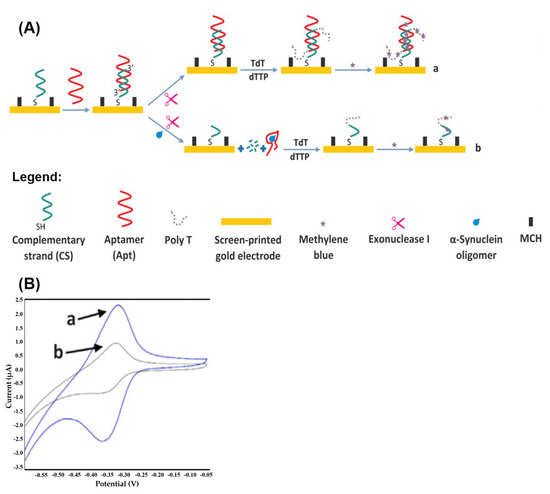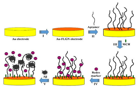 - Wang, X.; Gu, X.; Li, L.; Yu, B.; Lv, L.; Chen, Q.; Xu, M. An excellent electrochemical aptasensor for amyloid-β oligomers based on a triple-helix aptamer switch via target-triggered signal transduction DNA displacement events. Anal. Bioanal. Chem. 2021, 413, 3707–3716. [Google Scholar] [CrossRef]
