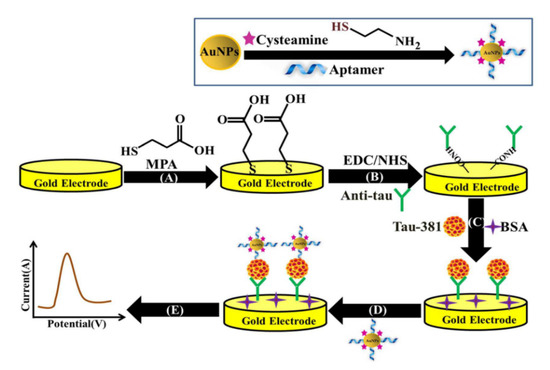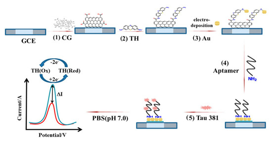 - Tao, D.; Shui, B.; Gu, Y.; Cheng, J.; Zhang, W.; Jaffrezic-Renault, N.; Song, S.; Guo, Z. Development of a label-free electrochemical aptasensor for the detection of Tau381 and its preliminary application in AD and non-AD patients’ sera. Biosensors 2019, 9, 84. [Google Scholar] [CrossRef] [PubMed]