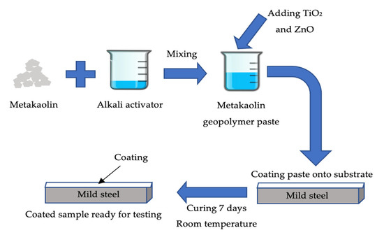 The solid-to-liquid (S/L) ratio varied throughout this analysis as shown in Table 1. The geopolymer paste (GP) was prepared by mixing metakaolin with Na2SiO3 and NaOH (alkaline activator solution) with overhead mechanical stirrer for 5 min until homogenously. Alkali activator ratios were fixed at 2.5 and NaOH molarity at 10M based on previous research. Then, the GP was added with 5 wt.% of TiO2 (GPTiO2) and varying percentages of ZnO (0.1, 0.3, 0.5, 0.7 and 0.9 wt.%) by weight (GPTiO2Zn). After prior mixing homogeneously, geopolymer paste was coated onto substrate by using brushing method. Mild steel plate was used as the substrate was cleaned with sandpaper to eliminate dirt and roughen the surface. The dimension of the mild steel substrate was 5.0 cm × 2.5 cm × 0.3 cm. Three layers of coating was applied to the substrate. After coating, the samples were cured at room temperature for 7 days. After 7 days of curing, the samples were tested with adhesion strength. The flow process has been summarized as Figure 2.