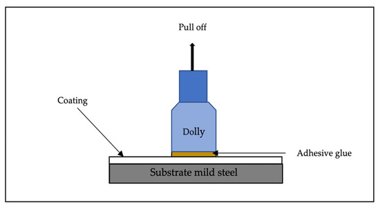 The most significance testing for coating is adhesion strength. The strength of metakaolin geopolymer paste added photocatalyst material was evaluated after 7 days of curing using Pull off Adhesion Tester brand Elcometer F106/3 from Elcometer Limited Company (Manchester, UK) according to ASTM D4541. A minimum of three samples were tested to evaluate the strength gain for the specimens. An adhesive was utilized to bond a test dolly to the metakaolin geopolymer layer for the adhesion procedure for 2 min. A pull-off adhesion test was utilized throughout the process to evaluate the level of cohesiveness that exists between the substrate and the coating. As the tension on the adhesion tester was increased, a spring system applied a lift force to the dolly. An indication on the scale depicts the numerical value of adhesion strength measured in terms of force per unit area. Figure 3 shows schematic diagram of the method of adhesion test occurs.