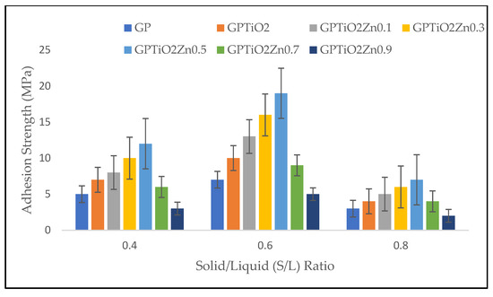 The adhesion strength was determined to identify the workability of metakaolin geopolymer paste for coating. The excellent adhesive strength of geopolymers is the basis for their application as substrate-interacting coating materials. Figure 4 shows the effect of S/L ratio based on adhesion strength between coating and substrate. The results indicate the optimum strength when S/L ratio is 0.6 before decreasing later due to faster setting time of the geopolymer paste at S/L ratio of 0.8. GPTiO2Zn0.5 at S/L ratio 0.6 achieved the highest adhesion strength (19 MPa), while GPTiO2Zn0.9 at S/L ratio 0.8 (2 MPa) drastically decreased the strength due to cracks occurring on the coating surface.