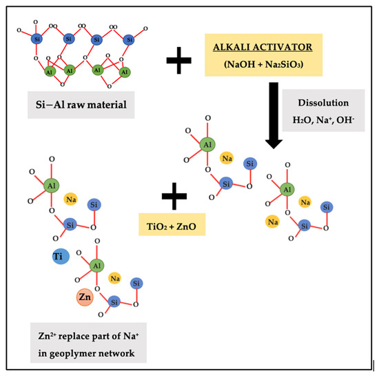 Schematic diagram of mechanism reaction between ZnO and geopolymer.
